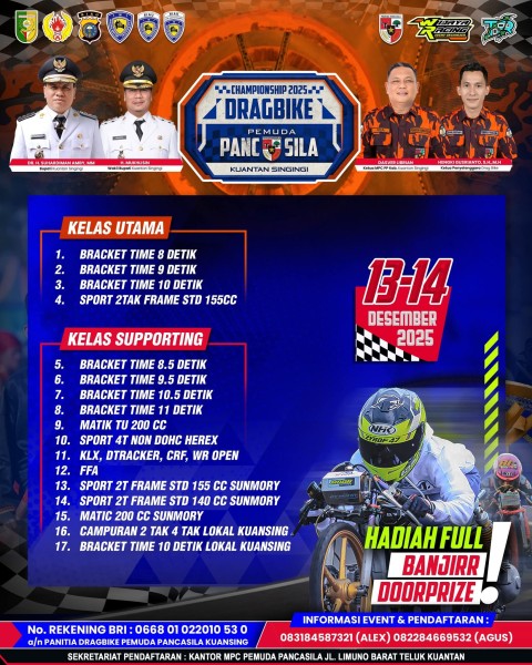 TELUK KUANTAN (KilasRiau.com) – Ajang balap motor bergengsi Dragbike Pemuda Pancasila Championship 2025 siap digelar di Kabupaten Kuantan Singingi pada 13–14 Desember 2025 mendatang.