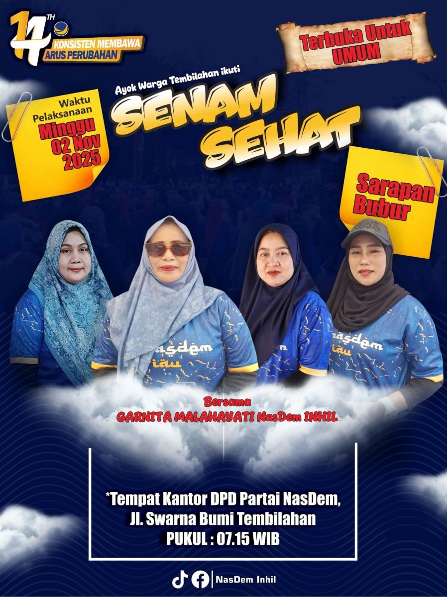 KILASRIAU.com — Dalam rangka memperingati Hari Ulang Tahun (HUT) ke-14 Partai Nasional Demokrat (NasDem), Dewan Pimpinan Daerah (DPD) Partai NasDem Kabupaten Indragiri Hilir (Inhil) menggelar kegiatan Senam Sehat dan pembagian sarapan bubur kacang gratis kepada masyarakat di kawasan Car Free Day (CFD) Jalan Swarna Bumi Tembilahan, Ahad (2/11/25).