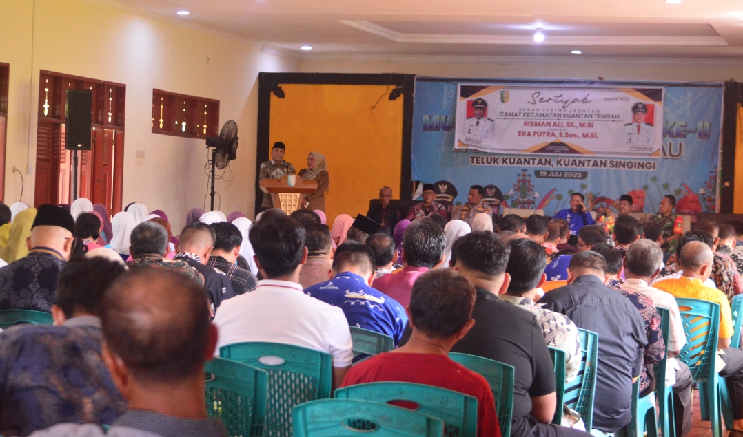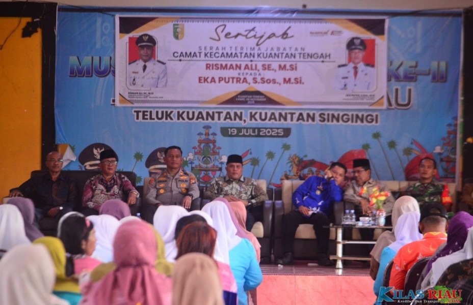 KUANTAN TENGAH (KilasRiau.com) — Pergantian pucuk pimpinan di Kecamatan Kuantan Tengah berlangsung khidmat dan penuh makna. Melalui prosesi Serah Terima Jabatan (Sertijab) yang digelar di Balai Adat Kantor Camat Kuantan Tengah, Kamis (6/11/2025), Risman Ali, SE., M.Si resmi menyerahkan jabatan Camat Kuantan Tengah kepada Eka Putra, S.Sos., M.Si.