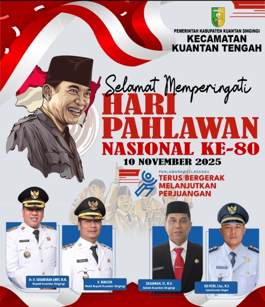 KUANTAN TENGAH (KilasRiau.com) - Dalam rangka memperingati Hari Pahlawan Nasional ke-80 tahun 2025, Pemerintah Kecamatan Kuantan Tengah, Kabupaten Kuantan Singingi, menyampaikan ucapan selamat dan ajakan kepada seluruh masyarakat untuk terus meneladani semangat juang para pahlawan yang telah berkorban demi kemerdekaan bangsa Indonesia.