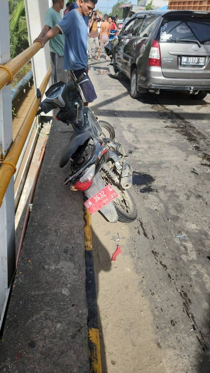 “Dari informasi yang kami terima itu kronologinya berbeda-beda. Namun sementara diketahui, mobil melaju dari arah Hulu menuju Hilir, kemudian menabrak pengendara motor Vega yang berlawanan arah di bawah Jembatan Parit 6. Setelah itu, di atas jembatan terjadi tabrakan lagi dengan satu sepeda motor lainnya (motor Supra X, red),” jelas Edo, Senin (10/11/2025).