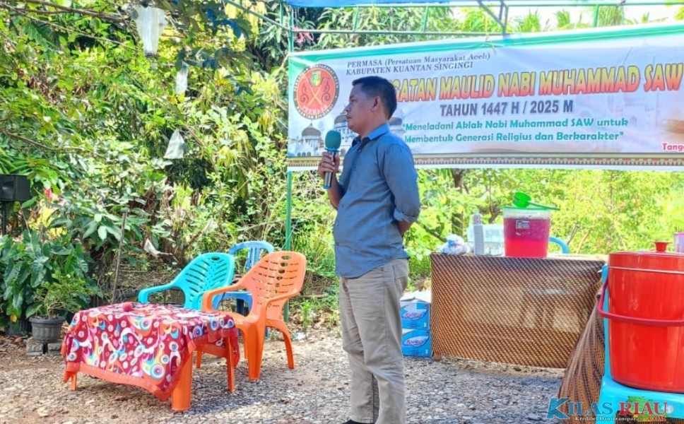 KUANTAN SINGINGI (KilasRiau.com) – Dalam rangka memperingati Maulid Nabi Muhammad SAW 1447 H / 2025 M, Persatuan Masyarakat Aceh (PERMASA) Kabupaten Kuantan Singingi menggelar acara religi dan sosial yang berlangsung khidmat di Desa Pulau Aro, Kecamatan Kuantan Tengah, Sabtu (16/11/2025). Kegiatan ini dihadiri langsung oleh Camat Kuantan Tengah, Eka Putra, S.Sos., M.Si., Ketua PERMASA Kuansing Tarmizi, SE, serta Kepala Desa Pulau Aro Herlianto bersama perangkat desa.