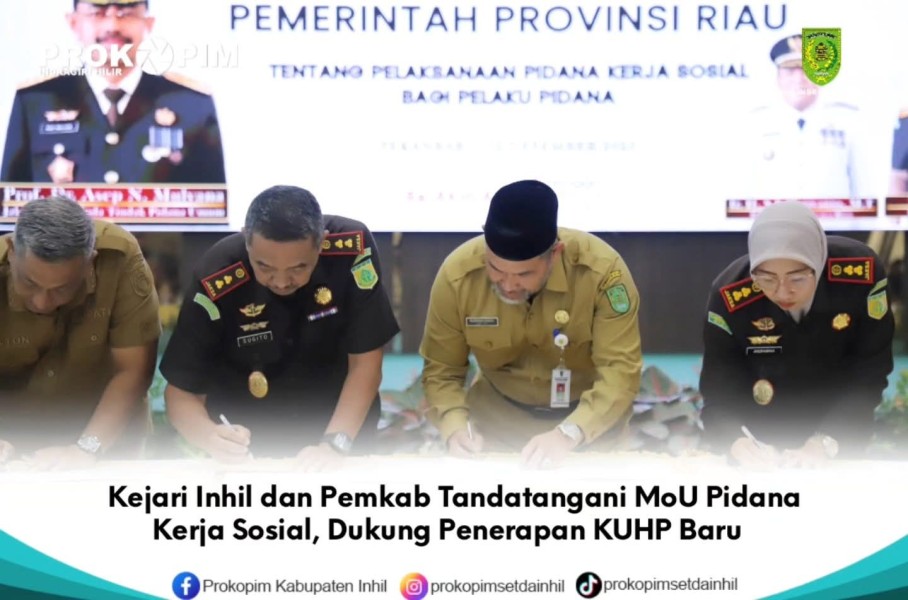 KILASRIAU.com - Menjelang implementasi pidana kerja sosial dalam KUHP baru tahun 2026, Kejaksaan Negeri Inhil, menandatangani Perjanjian Kerja Sama (PKS) dengan Pemerintah Kabupaten Inhil terkait pelaksanaan pidana kerja sosial bagi pelaku tindak pidana.