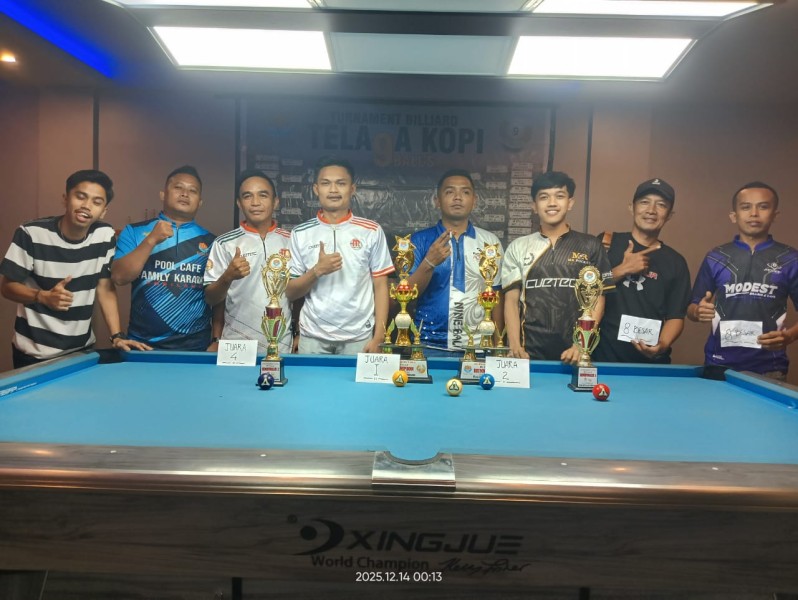 KILASRIAU.com, TEMBILAHAN-Turnamen Billiard 9 Ball Telaga Kopi (Teko) Cup 2025 resmi berakhir. Sabtu, (13/12/2025) di KTV&POOL Telaga Kopi Jalan Telaga Biru Parit 10 Tembilahan Hulu.
