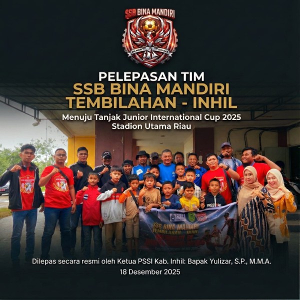 KILASRIAU.com – Sekolah Sepak Bola (SSB) Bina Mandiri Tembilahan resmi bertolak ke Provinsi Riau untuk mengikuti ajang Tanjak Junior Internasional Cup 2025 yang akan digelar di Stadion Utama Riau, pada 19–21 Desember 2025.