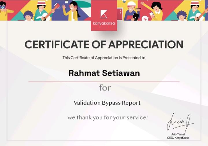 Penghargaan serupa juga datang dari KaryaKarsa, yang memberikan sertifikat apresiasi atas laporan Validation Bypass, sebuah celah keamanan yang berpotensi disalahgunakan apabila tidak segera ditangani.