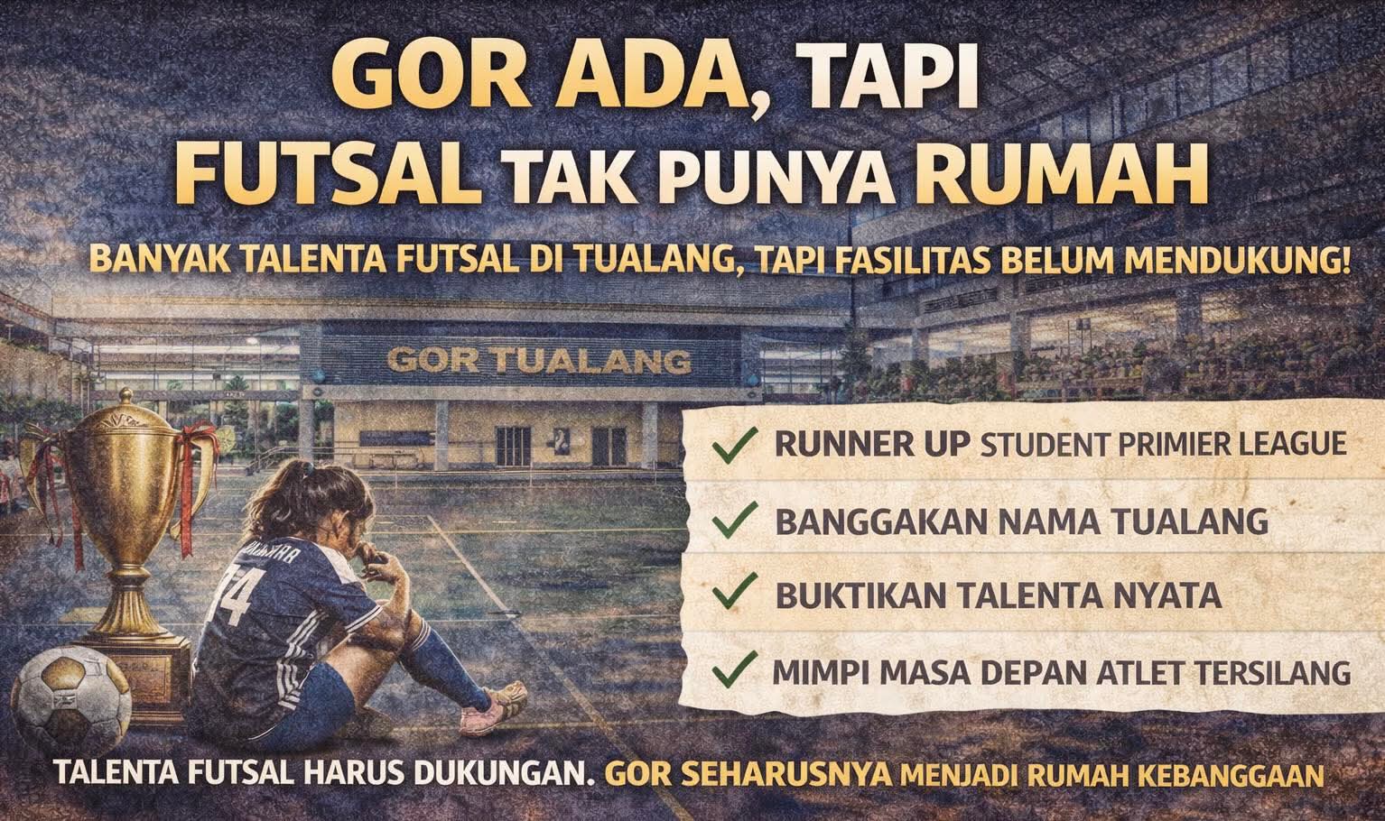 “Anak-anak berjuang dengan keterbatasan waktu dan tempat. GOR jarang benar-benar difokuskan untuk pembinaan futsal,” katanya.