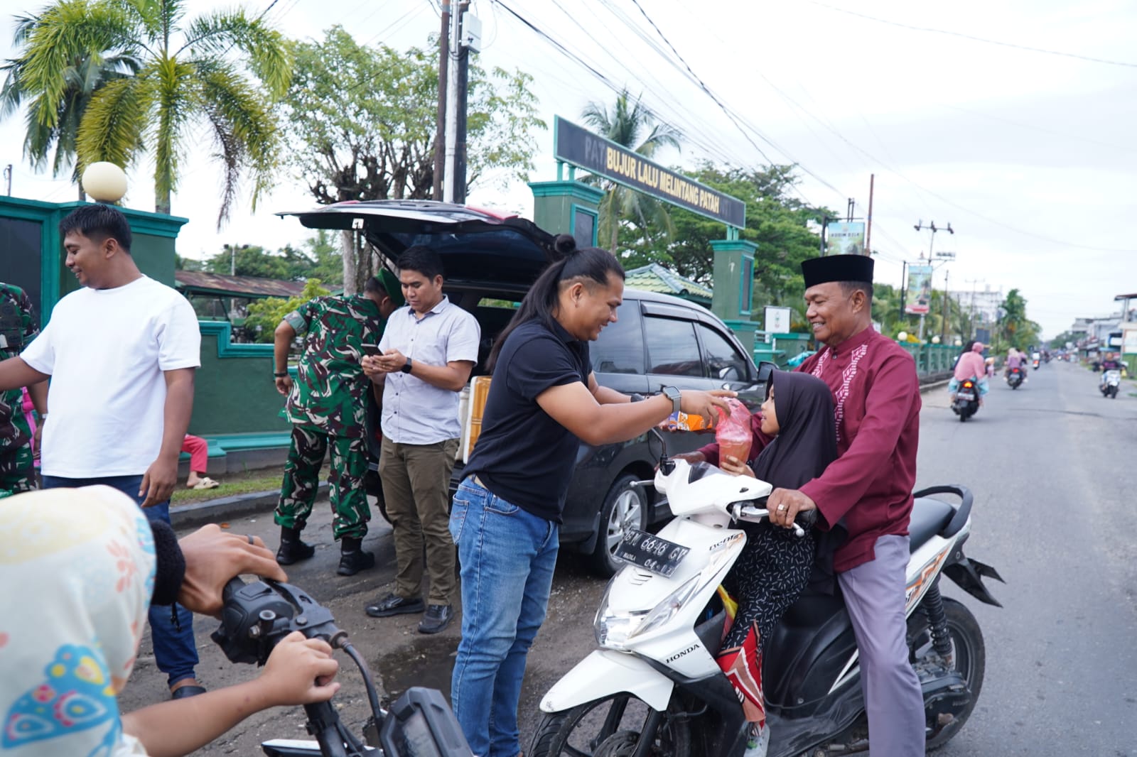 Suasana penuh kebersamaan dan kehangatan tampak terlihat saat personel TNI dengan ramah membagikan paket takjil kepada para pengendara dan warga yang melintas di kawasan tersebut.