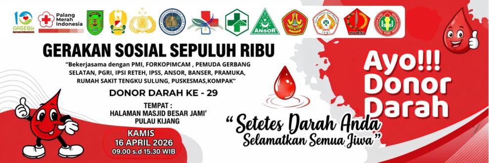 Kilasriau.com - Itulah yang dilakukan Pemuda Gerbang Selatan dalam Gerakan Sosial Sepuluh Ribu – Donor Darah ke-29 di Halaman Masjid Besar Jami’ Pulau Kijang, Kecamatan Reteh, Kamis 16 April 2026.