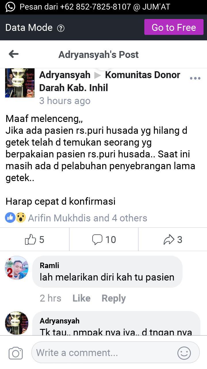 Dalam postingan di Grup Facebook Komunitas Donor Darah Inhil (KDDI), akun @adryansyah menulis informasi keberadaan pasien tersebut. Dalam postingannya mengatakan "Maaf melencengnya,, Jika ada pasien rs. puri husada yg hilang, d getek telah d temukan seorang yg berpakaian pasien rs. puri husada.. Saat ini masih ada d pelabuhan penyebrangan lama getek .." tulis adryansyah, Kamis (14/3/2019).