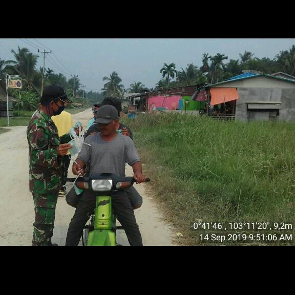 Meminimalisir Dampak kabut asap Babinsa koramil 07/Reteh ikut bagikan masker