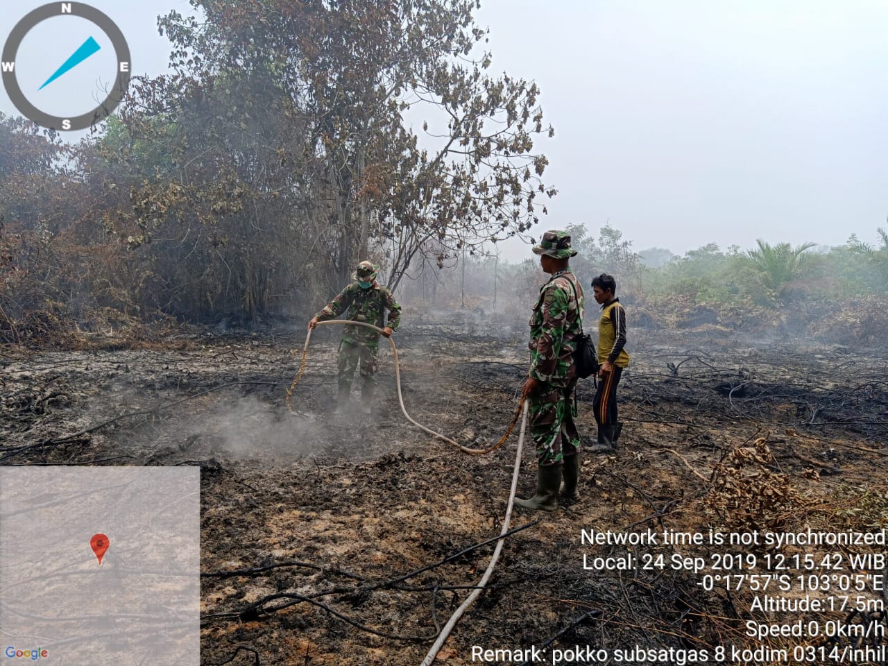 KILASARIAU.com, Batang Tuaka - Babinsa dan Personil Koramil 12/Batang Tuaka bersama masyarakat melaksanakan pengecekan dan pendinginan lahan terbakar di Desa Kuala Seibatu, Kecamatan Batang Tuaka, Senin (24/9/2019).