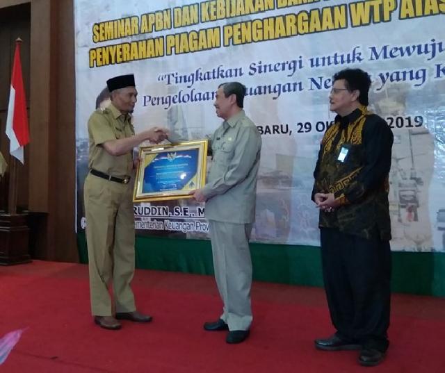 Piagam tersebut di serahkan langsung oleh Gubernur Riau H. Syamsuar yang di dampingi oleh kepala perwakilan Kementerian Keuangan RI Provinsi Riau Bakhataruddin.