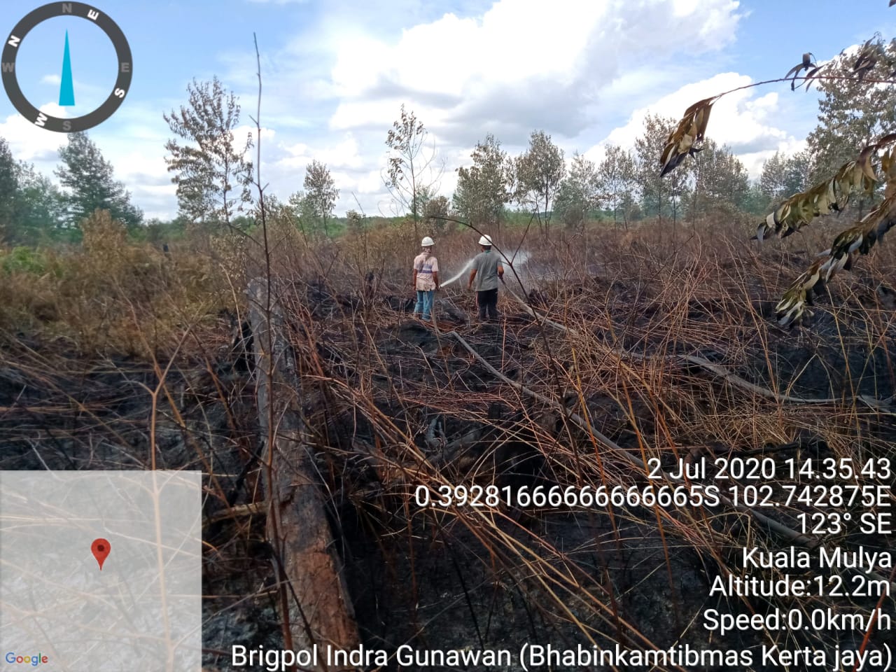 KILASRIAU.com - Kapolres Inhil, AKBP Indra Duaman Siahaan SIK memimpin langsung pemadaman titik api dan pendinginan kebakaran lahan di lahan semak belukar, Parit 4, Dusun Bahagia, Desa Pekan Tua, Kecamatan Kempas, Kabupaten Inhil, Kamis (2/7/2020).