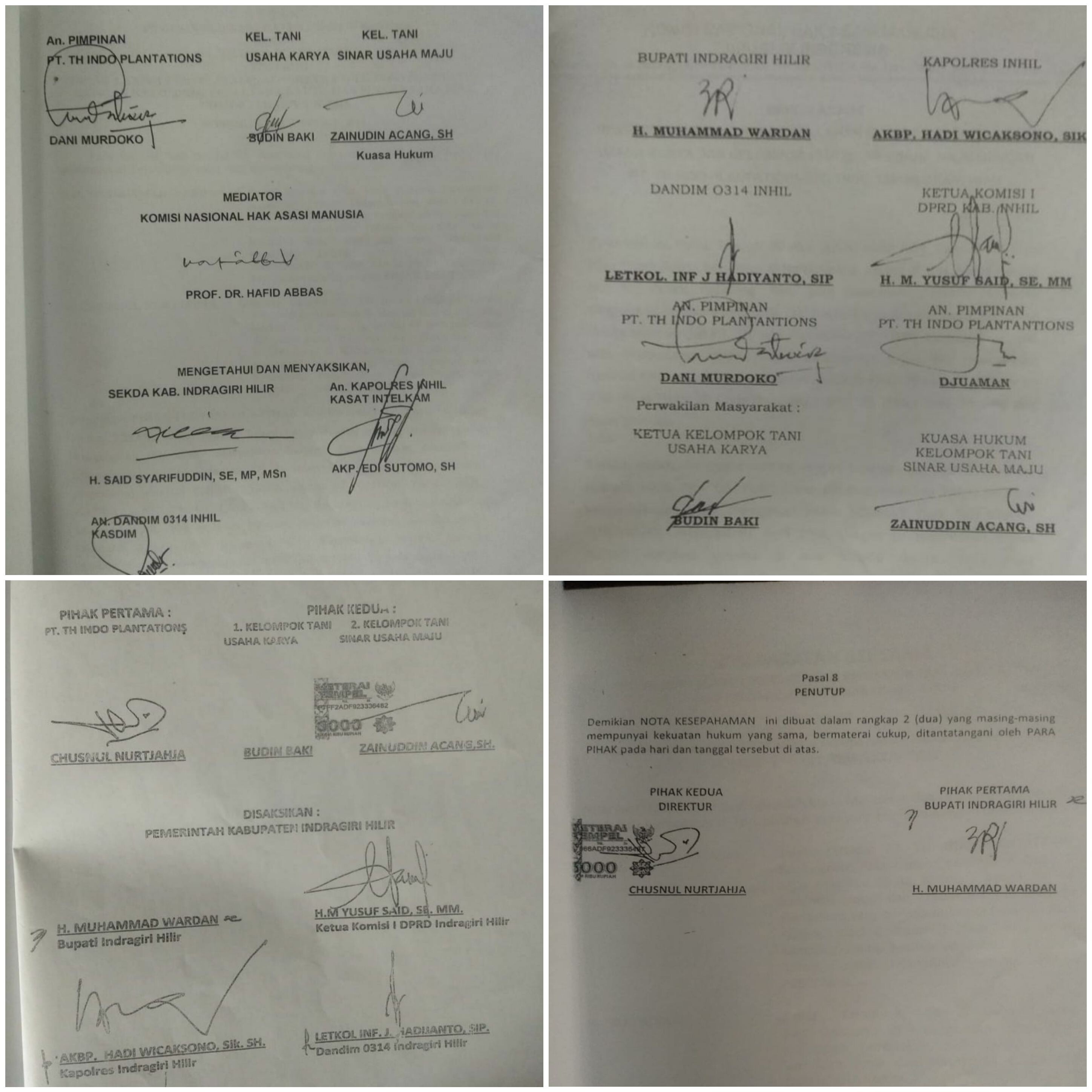 Lebih lanjut Panglima PAO menyampaikan isi dari kesepakatan tersebut antar pihak PT. TH Indo Plantations dengan kelompok tani Sinar Usaha Maju yaitu; Pada hari ini Rabu tanggal Enam bulan April tahun Dua Ribu Enam Belas bertempat di Hotel Premiere Pekanbaru telah dilaksanakan silahturahmi Pemerintah Kabupaten Indragiri Hilir yang dihadiri oleh Bupati Indragri Hilir, Kapolres Indragiri Hilir, Dandim 0314 Indragiri Hilir, Ketua Komisi 1 DPRD Kabupaten Indragiri Hilir dan Sekretaris Daerah Kabupaten Indragiri Hilir bersama jajaran direksi PT. TH Indo Plantations dalam upaya penyelesaian sengketa lahan kelompok Tani Usaha karya dan Kelompok Tani Sinar Usaha Maju Desa Tanjung Simpang Kecamatan Pelangiran dengan kesimpulan sebagai berikut: