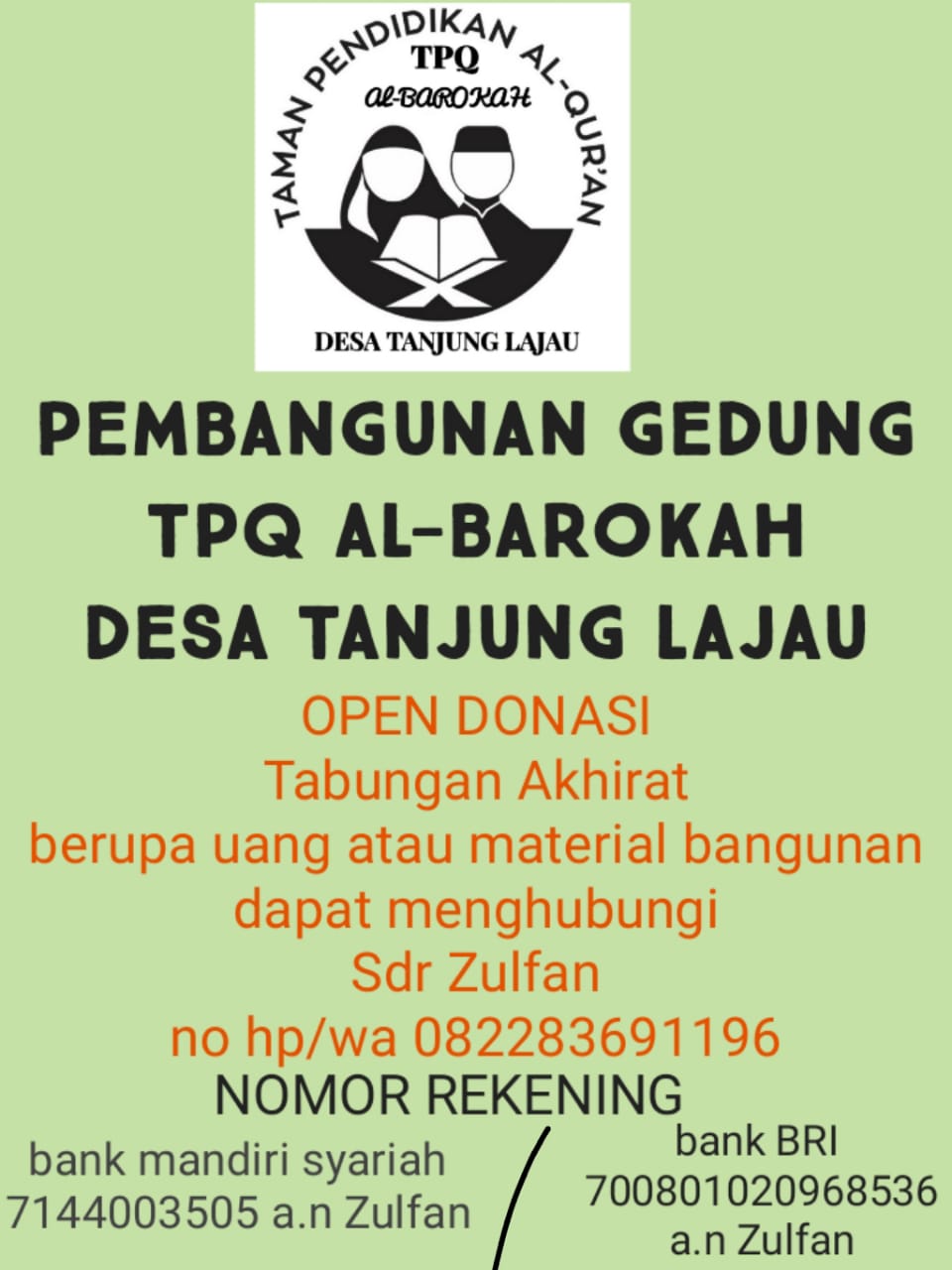 "Tabungan akhirat berupa uang atau material bangunan dapat menghubungi saudara Zulfan,