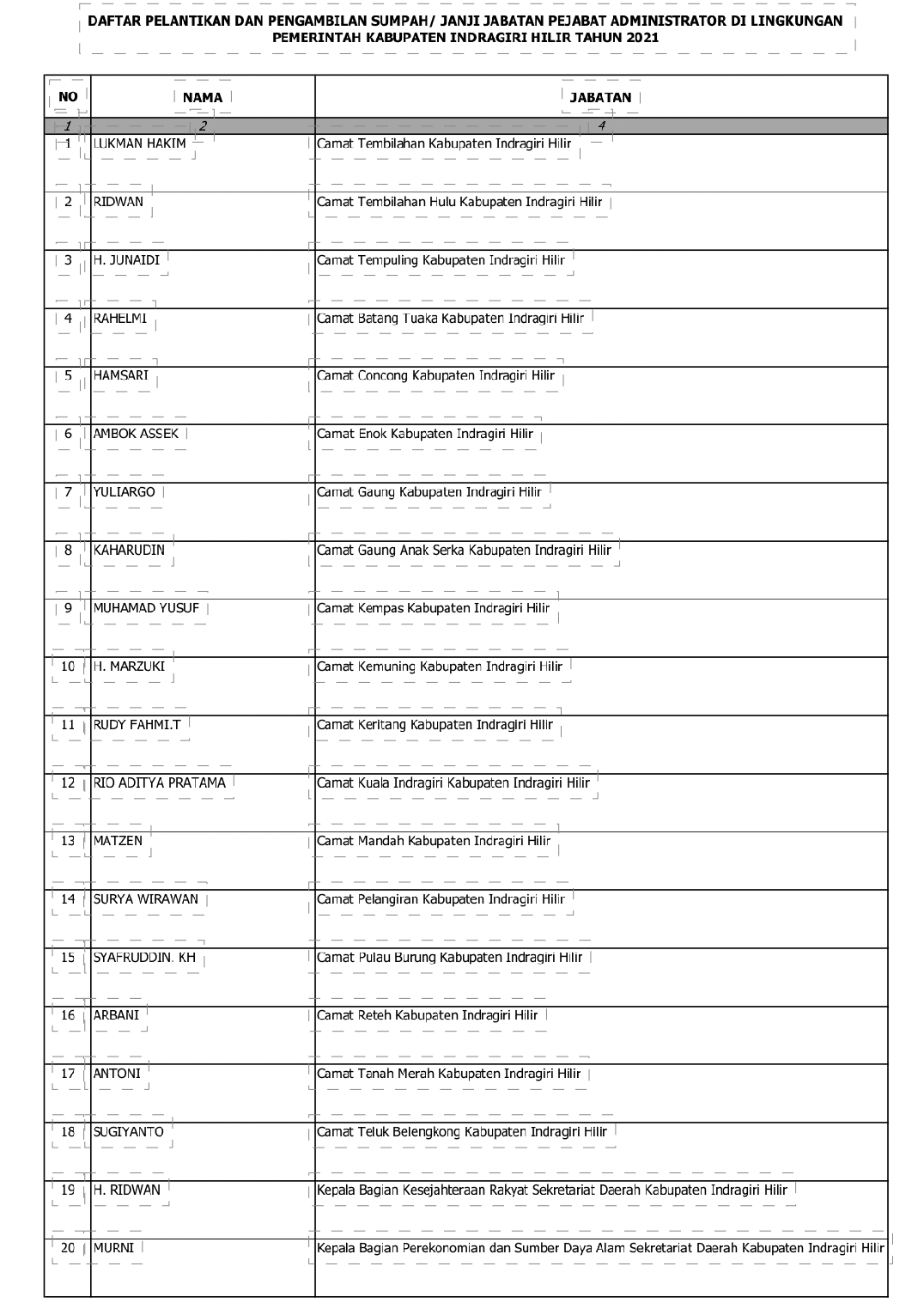 KILASRIAU.com - Kurang lebih sebanyak 104 pejabat dilantik dan mengambil sumpah/janji jabatan pejabat administrator dilingkungan Pemerintahan Kabupaten Inhil tahun 2021 di salah satu gedung di Tembilahan, Rabu (17/02) malam.