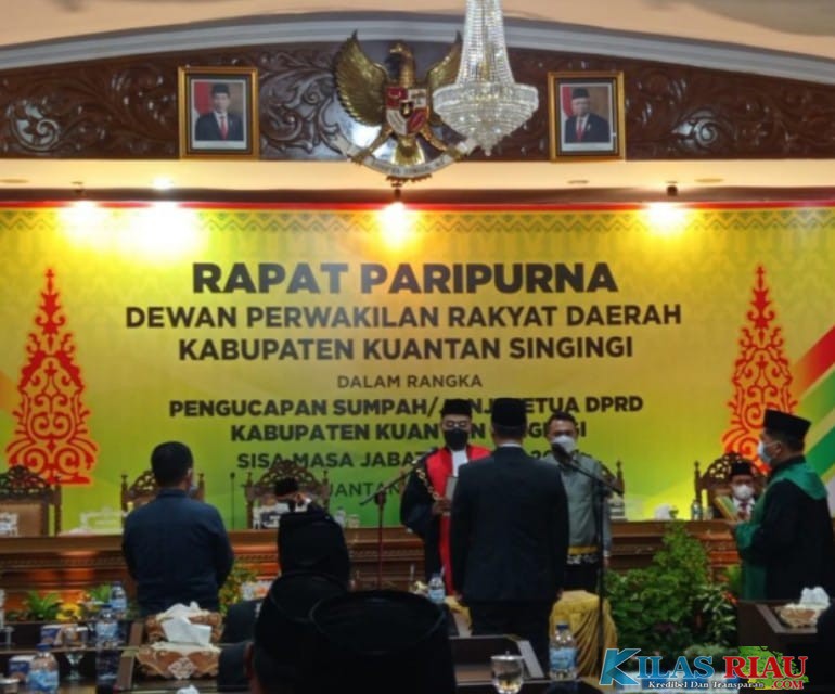 KILASRIAU.com - Dewan Perwakilan Rakyat Daerah (DPRD) Kabupaten Kuantan Singingi mengadakan Rapat Paripurna dalam rangka pelantikan dan pengucapan sumpah/janji oleh Ketua Pengadilan Negeri Teluk Kuantan, Wijawiyata, SH untuk Dr. Adam, SH. MH., Sebagai Ketua DPRD Kabupaten Kuansing sisa masa jabatan 2019-2024 di Gedung DPRD Kuansing jalan Rusdi S Abrus, Komplek Perkantoran Pemda Kabupaten Kuantan singingi, Sei Jering , Kamis, 25 Februari 2021.