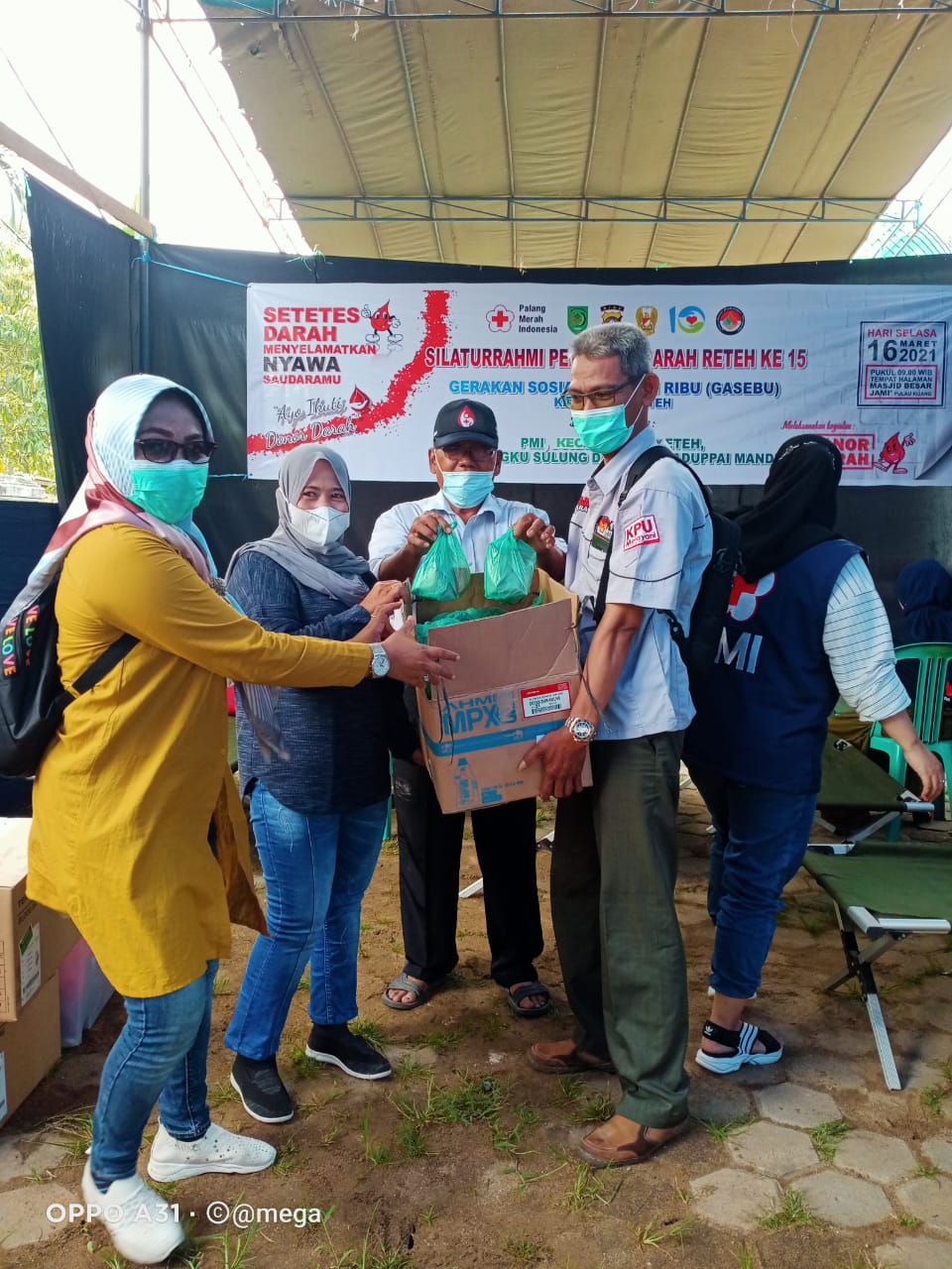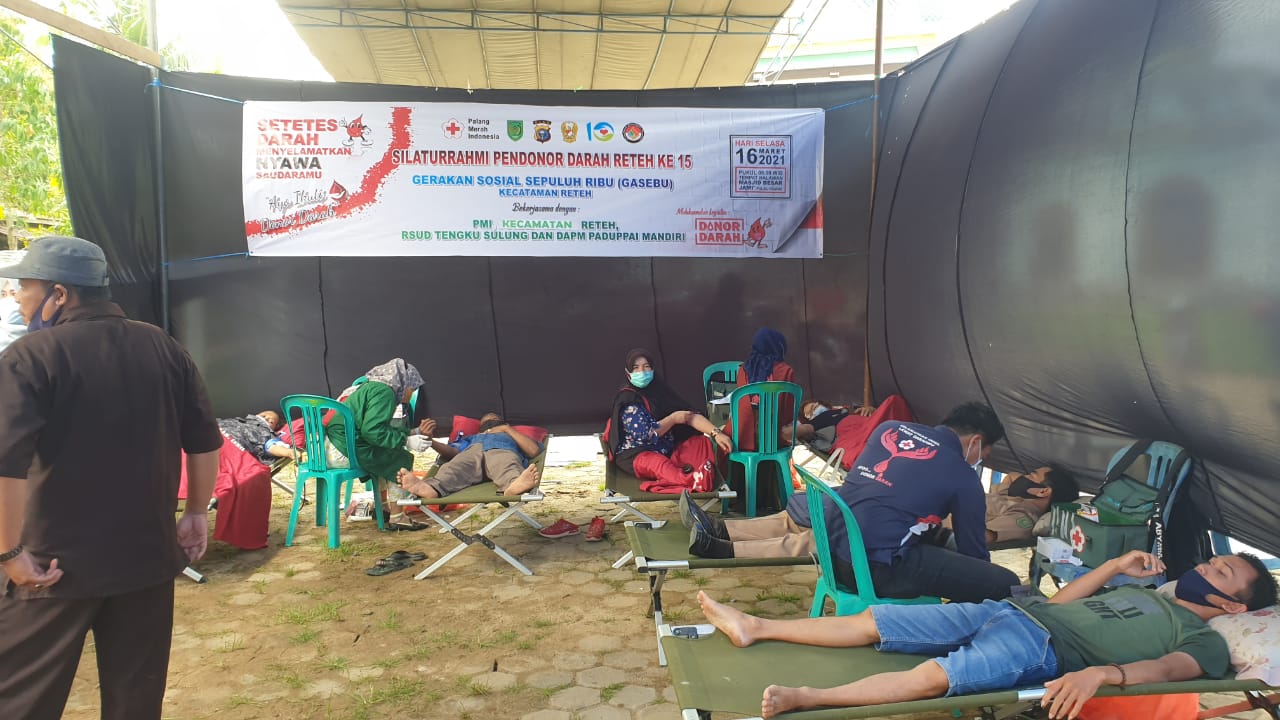 KILASRIAU.com - Gerakan Sosial Sepuluh Ribu (GASEBU) bekerja sama dengan Palang Merah Indonesia (PMI), Rumah Sakit Tengku Sulung dan DAPM Paduppa Mandiri Kecamatan Reteh kembali melaksanakan kegiatan Donor Darah bertempat di Halaman Masjid Besar Jami' Pulau Kijang Kecamatan Reteh, Selasa (16/03/2021).