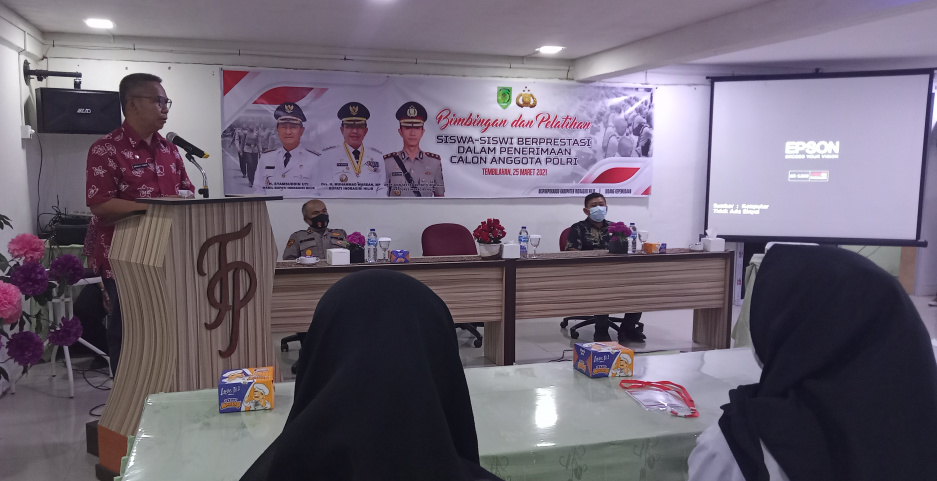 KILASRIAU.com - Dinas Pariwisata, Pemuda dan Olahraga, dan Kebudayaan (Disparporabud) Kabupaten Indragiri Hilir (Inhil) bekerjasama dengan Polres Inhil menggelar bimbingan dan pelatihan siswa-siswi berprestasi dalam penerimaan Calon Anggota Polri di Aula Hotel Tembilahan Pratama, Kamis (25/3/2021).
