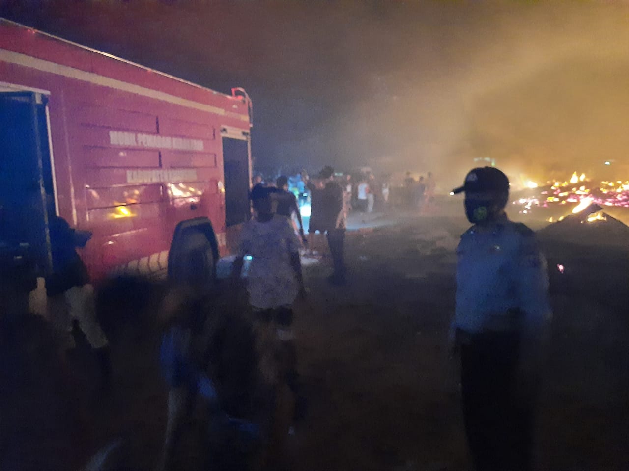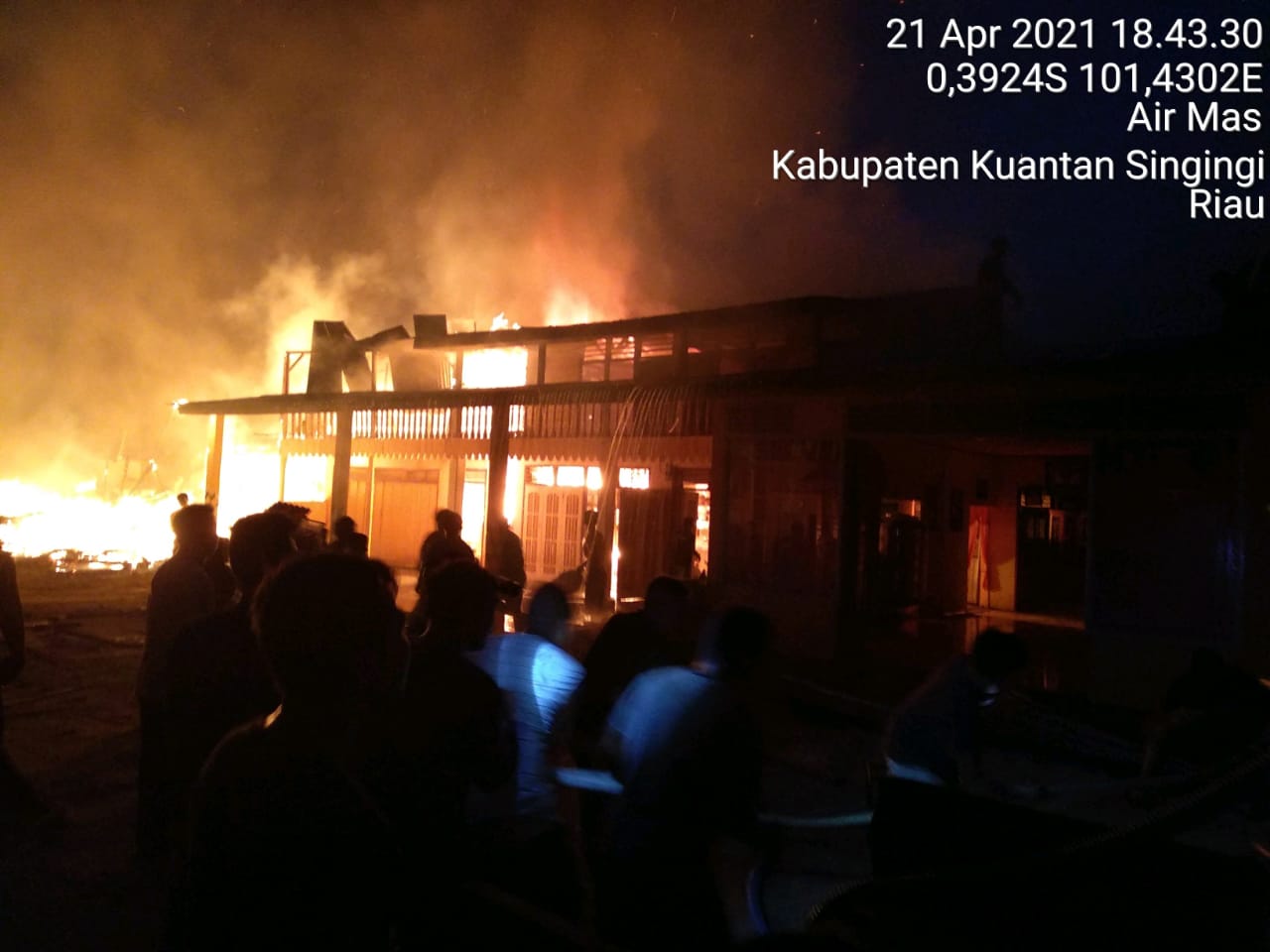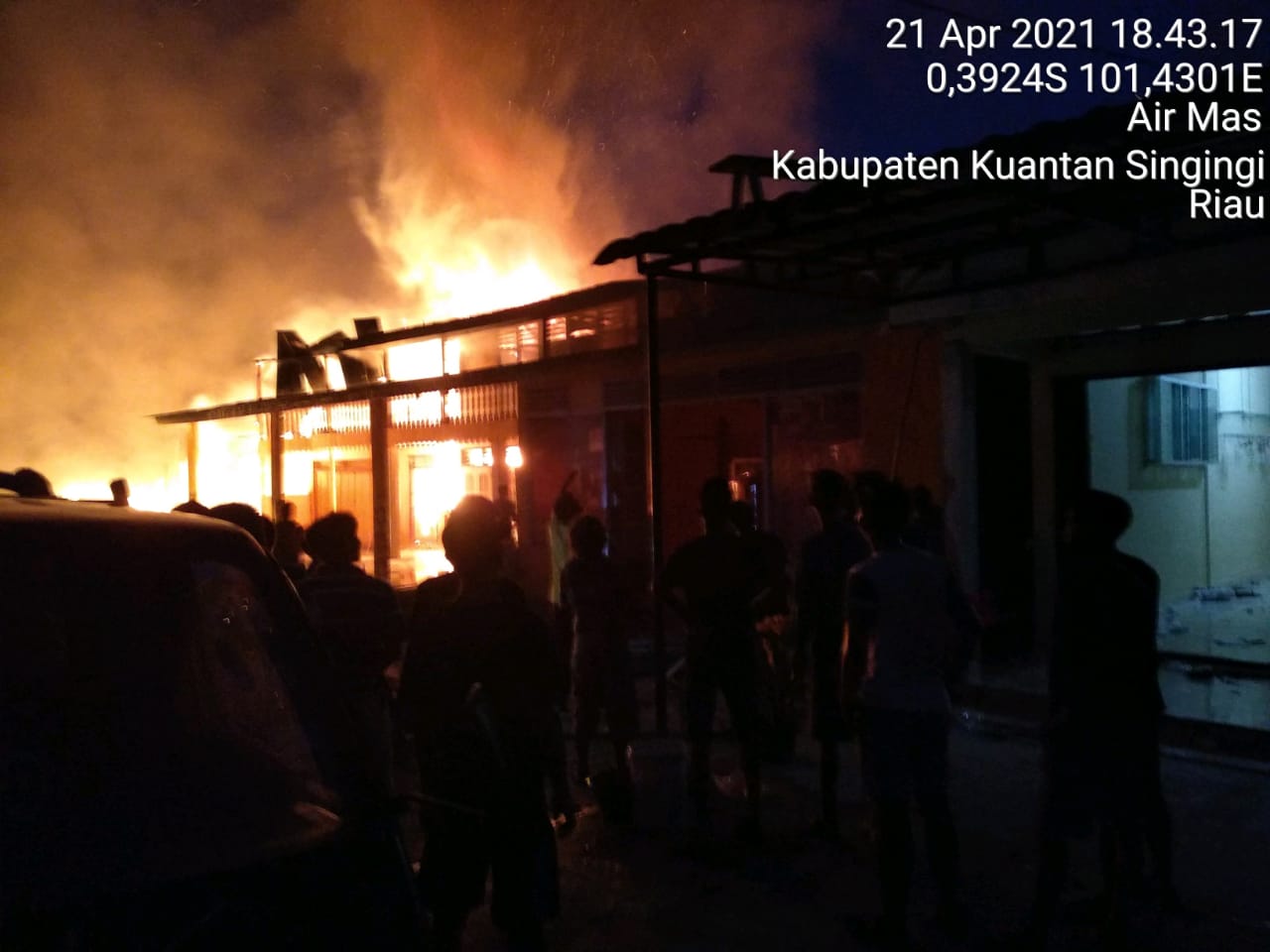 Empat unit rumah warga di RT 16 / RW 03 ditepi jalan poros depan Pasar lama F6 Desa Air Mas Kecamatan Singingi, Kabupaten Kuantan Singingi (Kuansing), Riau ludes dilalap sijago merah dalam kebakaran yang terjadi pada Rabu (21/04/2021) malam.