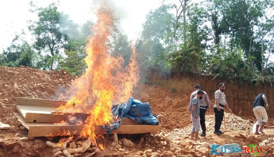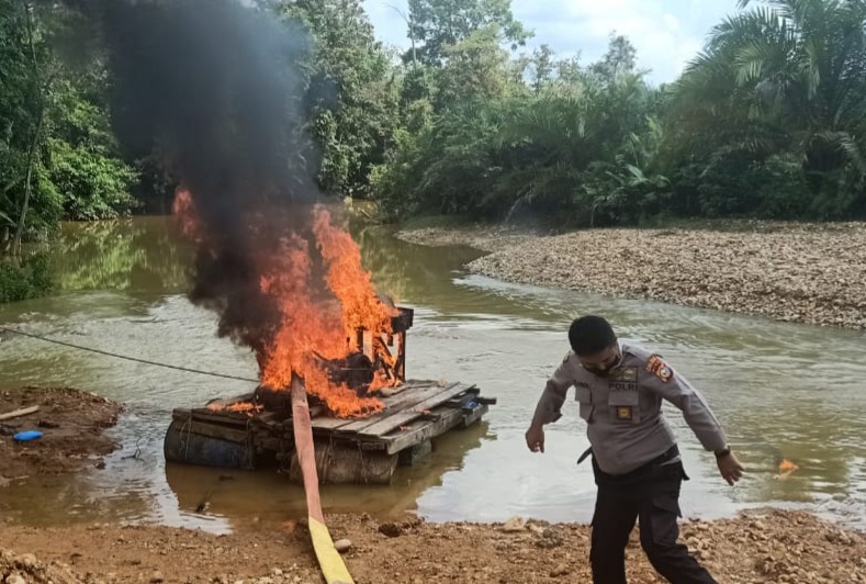 Selanjutnya satu rakit untuk mendompeng, dua Asbuk dan satu pondok terpal dibakar agar tidak bisa digunakan lagi.