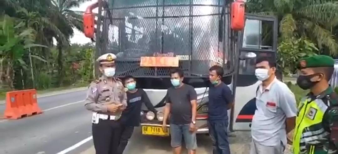 Bus PO Sentosa dari arah Jambi tersebut tidak bisa menunjukan dokumen yang butuhkan untuk melintas di posko penyekatan larangan mudik perbatasan lintas timur KM 295, Kelurahan Selensen, Kecamatan Kemuning, Kabupaten Inhil, Riau, Jum’at (7/5) sore.