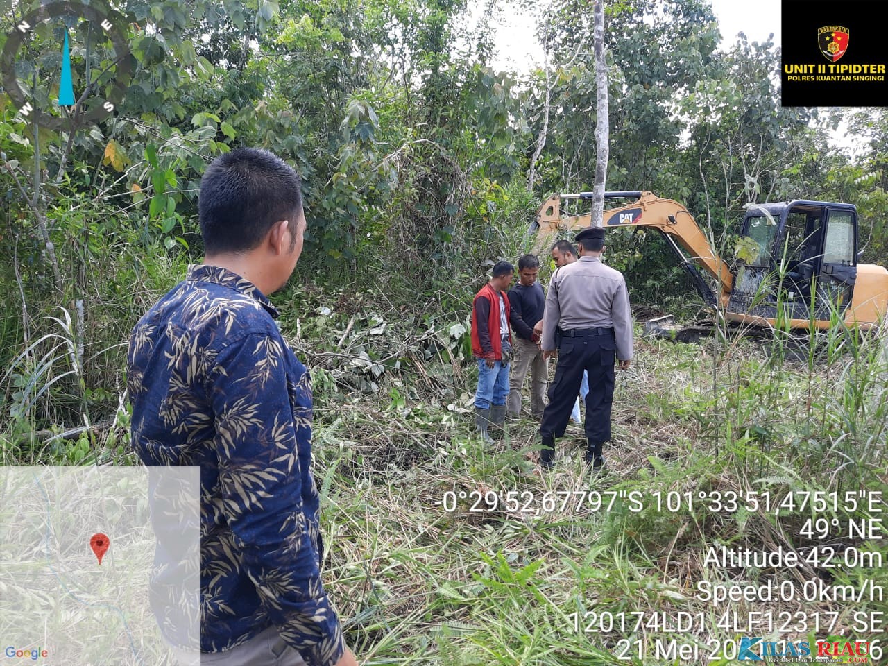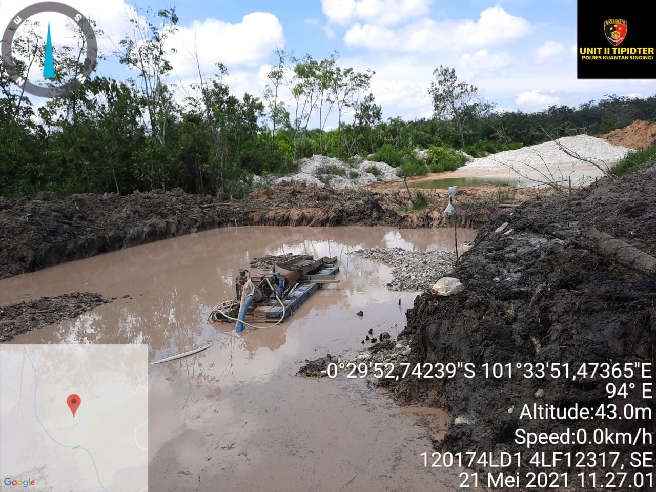 Pada saat sedang patroli rutin, ditemukan adanya 1 unit dompeng yang sedang beroperasi melakukan aktivitas penambangan emas tanpa izin diareal kebun karet milik tersangka AJ(44) yang diketahui seoran petani di desa Muaro Sentajo Kecamatan Sentajo Raya dengan cara digali oleh alat berat berbentuk kolam berukuran sekitar 7 m x 8 m dan dompeng dioperasikan didalam galian tersebut.