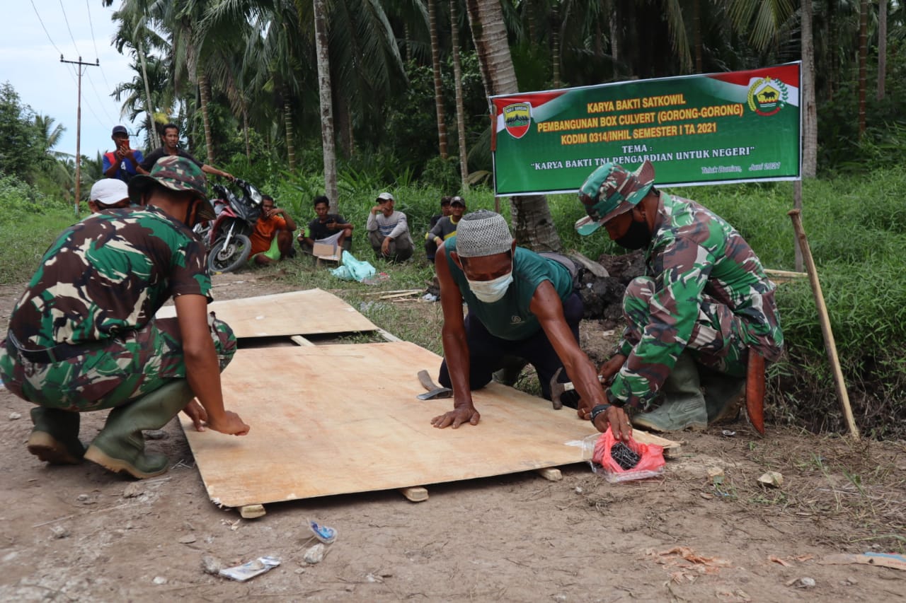 KILASRIAU.com - Proses kegiatan karya Bhakti Satkowil pembangunan box Colvert Gorong-gorong kodim 0314/Inhil semester I tahun 2021 yang berlokasi Parit Makajirah perbatasan Kelurahan Pelangiran dengan desa Teluk bunian, sedang berlangsung, Minggu (20/6/2021).