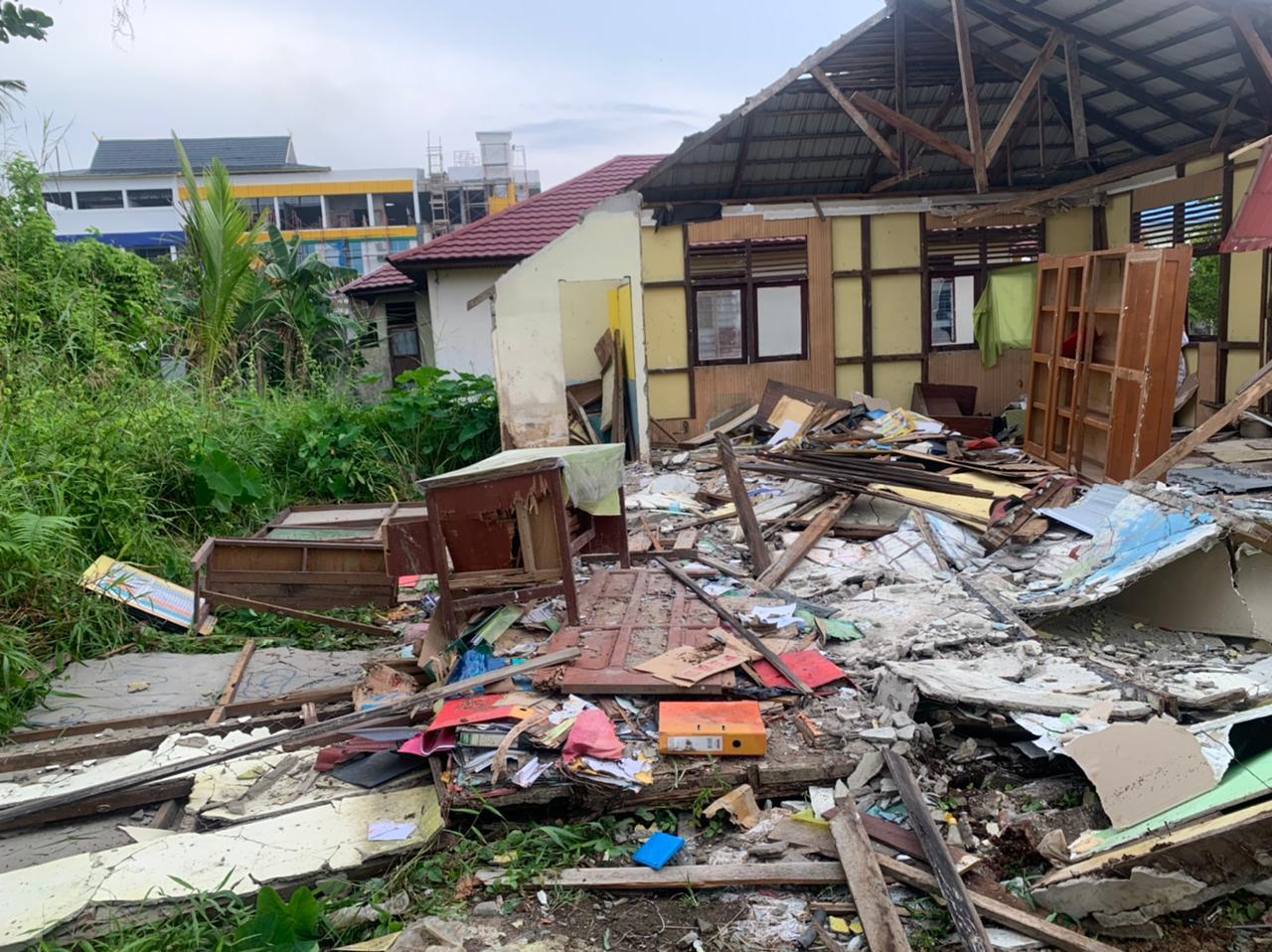 Dalam pantauan Kilasriau.com saat melihat langsung di lokasi kejadian bangunan kantor UPT Dinas Pendidikan sudah hancur dan bangunan sudah rata dengan tanah. (Sr)