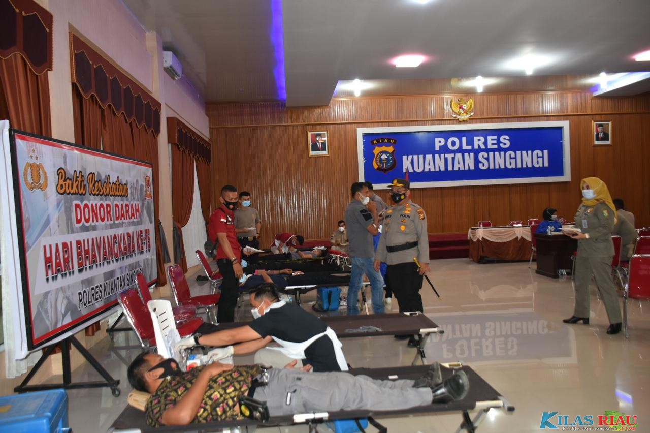 Teluk Kuantan, KilasRiau.com - Dalam rangka Hari Ulang Tahun (HUT) Bhayangkara ke 75 tahun, Kepolisian Resort (POLRES) Kuantan Singingi (KUANSING) melaksanakan kegiatan bakti kesehatan donor darah yang bertempat di Aula Sanika Satyawada Polres Kuansing pada Selasa (22/06/2021) pukul 09.00 WIB.