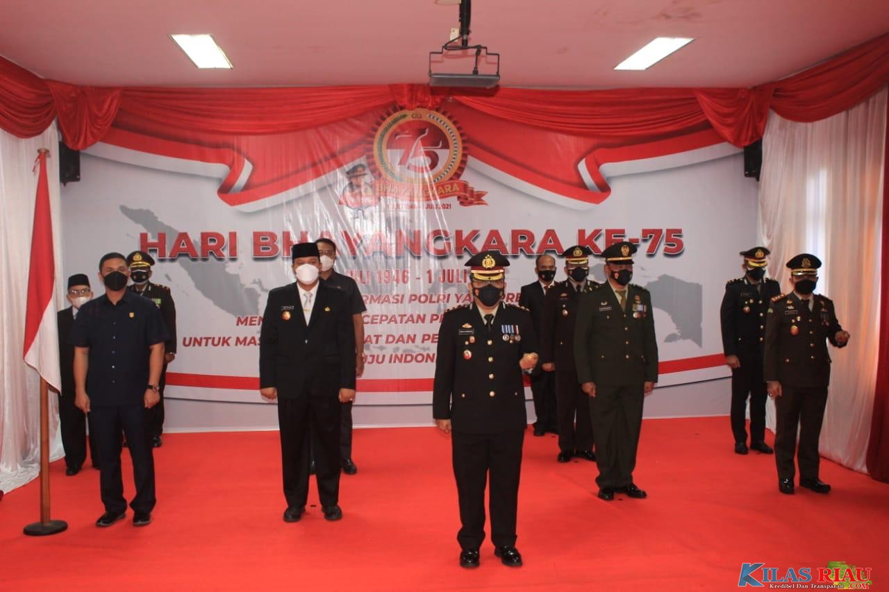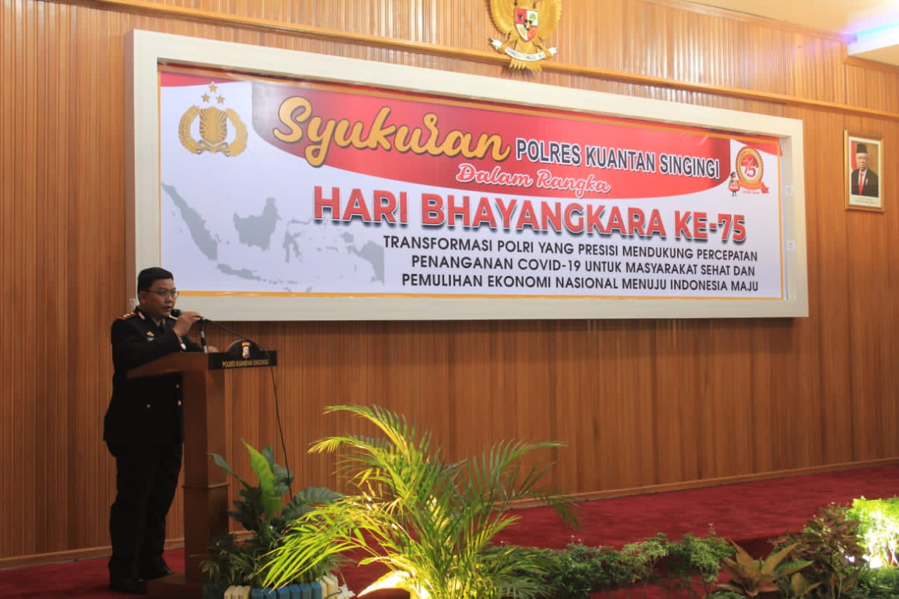 Dalam rangka memperingati hari Bhayangkara ke-75 yang dipimpin oleh Presiden RI Joko Widodo dihadiri secara Virtual oleh Forkopimda Kabupaten Kuantan Singingi di Gedung Rupatama Markas Kepolisian Resort Kuantan Singingi, Kamis 01 Juli 2021, dengan tema “Transformasi Polri yang Presisi, mendukung percepatan Penanganan Covid 19 untuk Masyarakat Sehat dan Pemulihan Ekonomi Nasional Untuk Indonesia Maju“