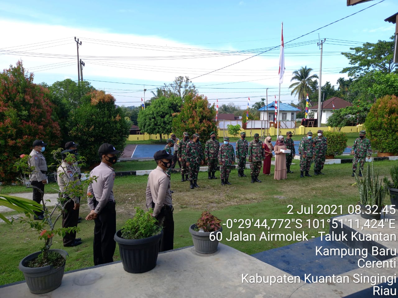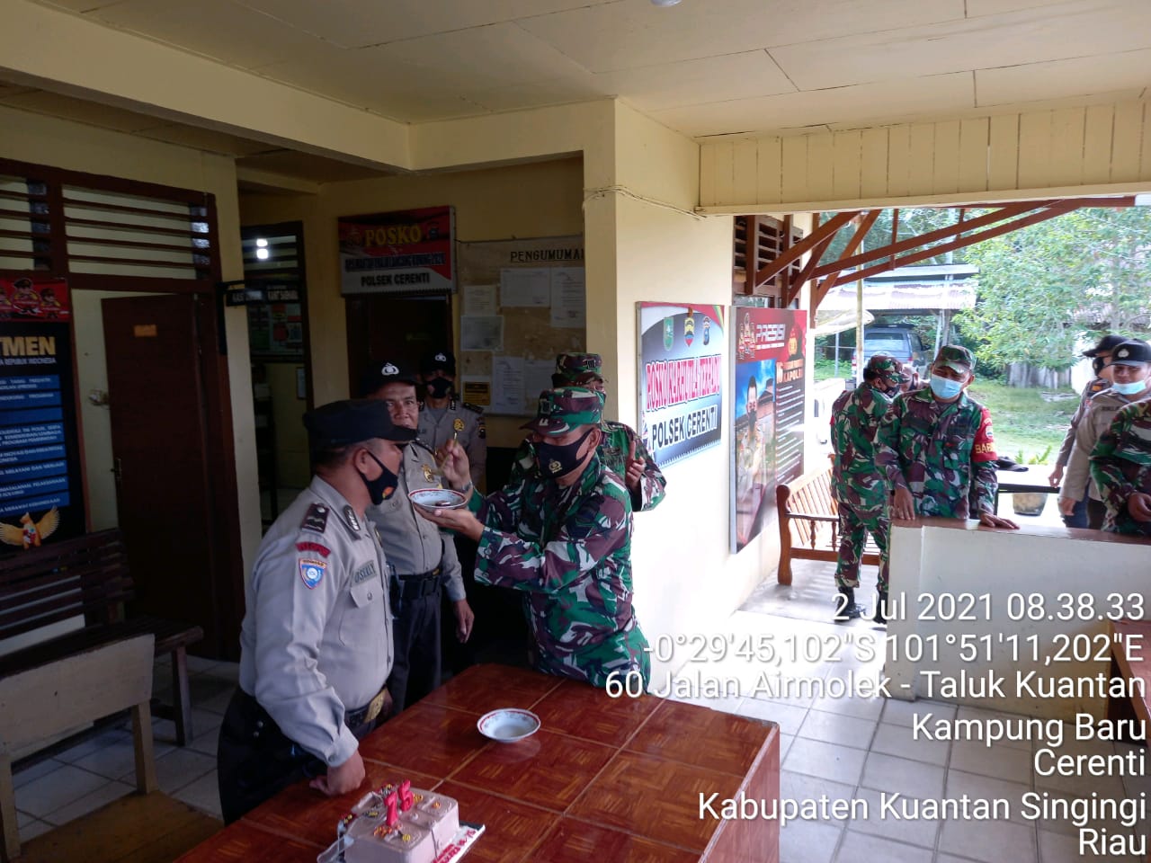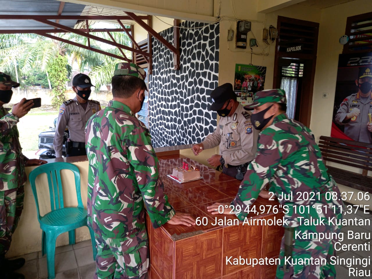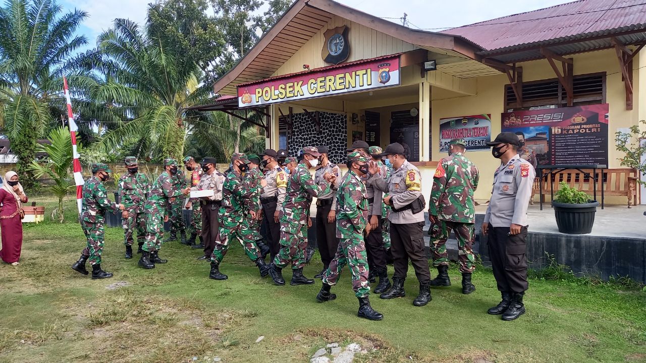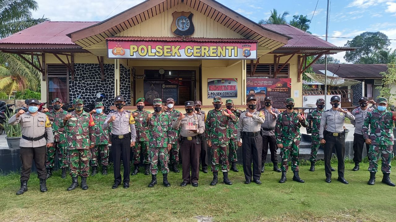 Cerenti, Kuansing, KilasRiau.com - Dalam rangka Hari Ulang Tahun (HUT) Bhayangkara ke-75, Komando Rayon Militer (Koramil) 06/ Cerenti Komando Distrik Militer (Kodim) 0302 Inhu datang dadakan memberikan kejutan ke Kepolisian Sektor (Polsek) Cerenti Jajaran Kepolisian Resort (Polres) Kuantan Singingi (Kuansing) pada Jum'at (02/07/2021).