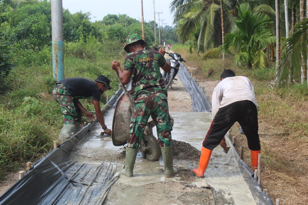 KILASRIAU.com - Satgas TMMD ke 111 Kodim 0314/lnhil bersama masyarakat terus geber pengerjaan sasaran fisik semenisasi jalan Yakub ll yang merupakan jalan penghubung antara Desa Teluk Bunian menuju kota Kecamatan Pelangiran, Kabupaten lnhil. Rabu, (07/07/2021).