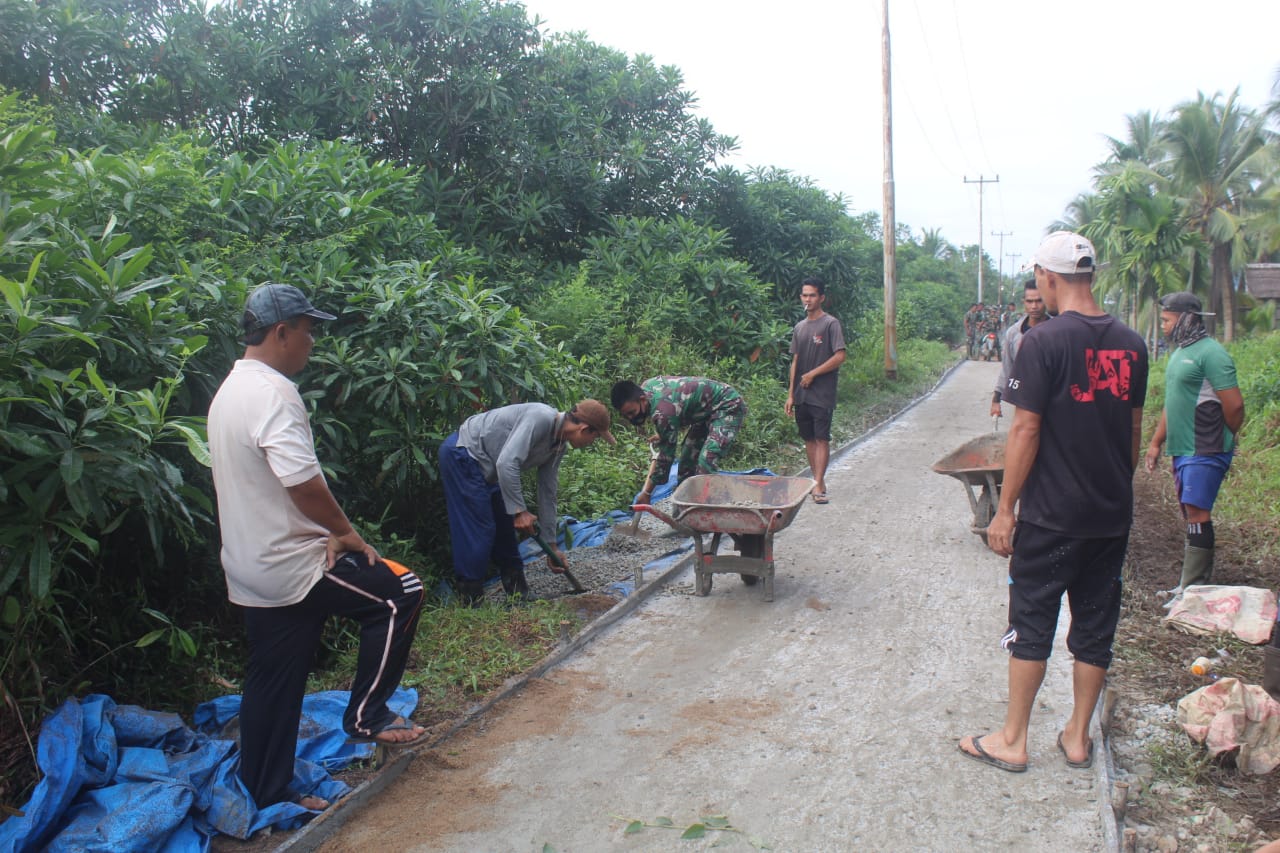 KILASRIAU.com - Cuaca pagi yang cerah, menambah semangat gotong royong Satgas TMMD dengan masyarakat Desa Teluk Bunian yang sedang mengebut pekerjaan di sasaran fisik semenisasi jalan Yakub ll, Desa Teluk Bunian, Kecamatan Pelangiran, Kabupaten lnhil. Minggu, (11/07/2021).