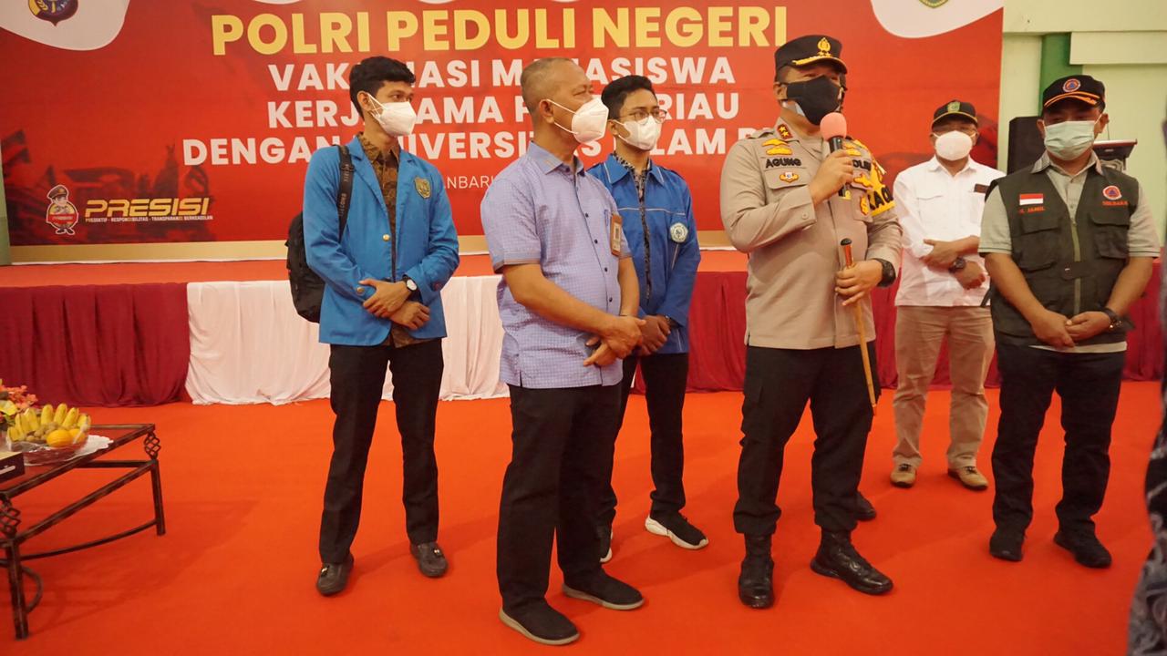 "Apa yang dilakukan oleh Bapak Kapolda riau Irjen Pol Agung Setya Imam Effendi bersama dengan mahasiswa UIR dalam vaksinasi ini merupakan yang pertama di kampus UIR serta dapat berlanjut untuk kedepan nya. Dan mudah-mudahan ini bisa menjadi role model dalam melakukan percepatan vaksinasi bagi mahasiswa dan masyarakat pada umumnya," ungkap agus.