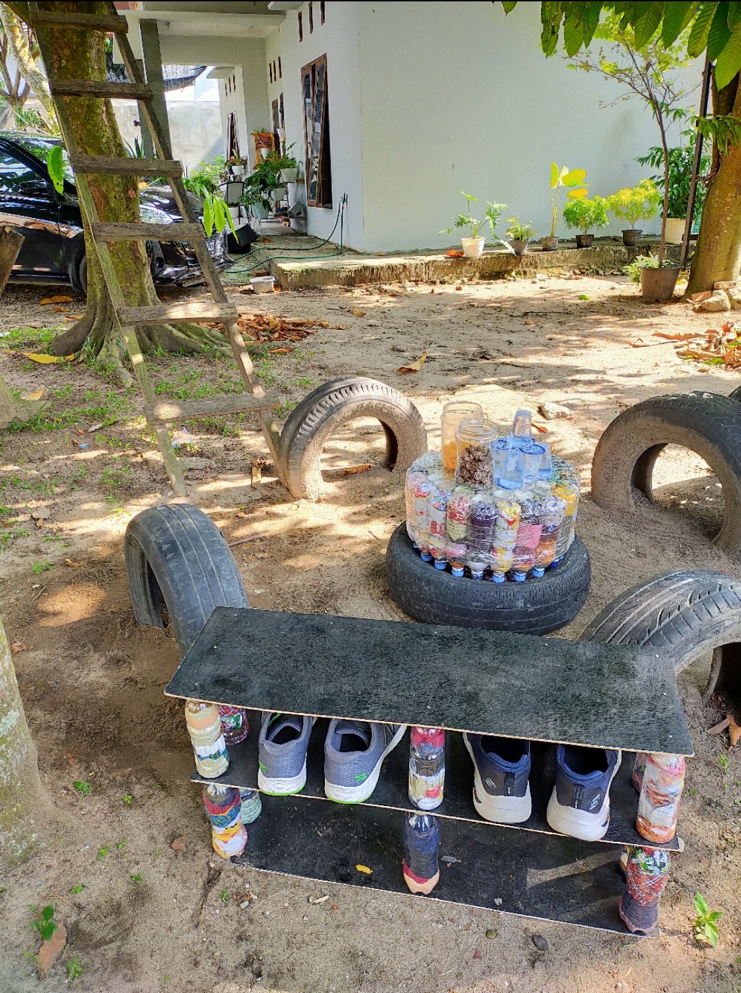 "Dalam pembuatan Ecobrick sebenarnya tidaklah sulit. Yang perlu dilakukan hanyalah memasukkan sampah plastik yang sudah bersih dan kering kedalam botol plastik yang telah dibersihkan hingga terisi padat. Setelah botol-botol tersebut terisi padat, yang perlu dilakukan hanyalah menyusun botol tersebut menjadi bentuk yang diinginkan, disini kami menyulapnya menjadi meja dan rak sepatu," jelas Dhimas.