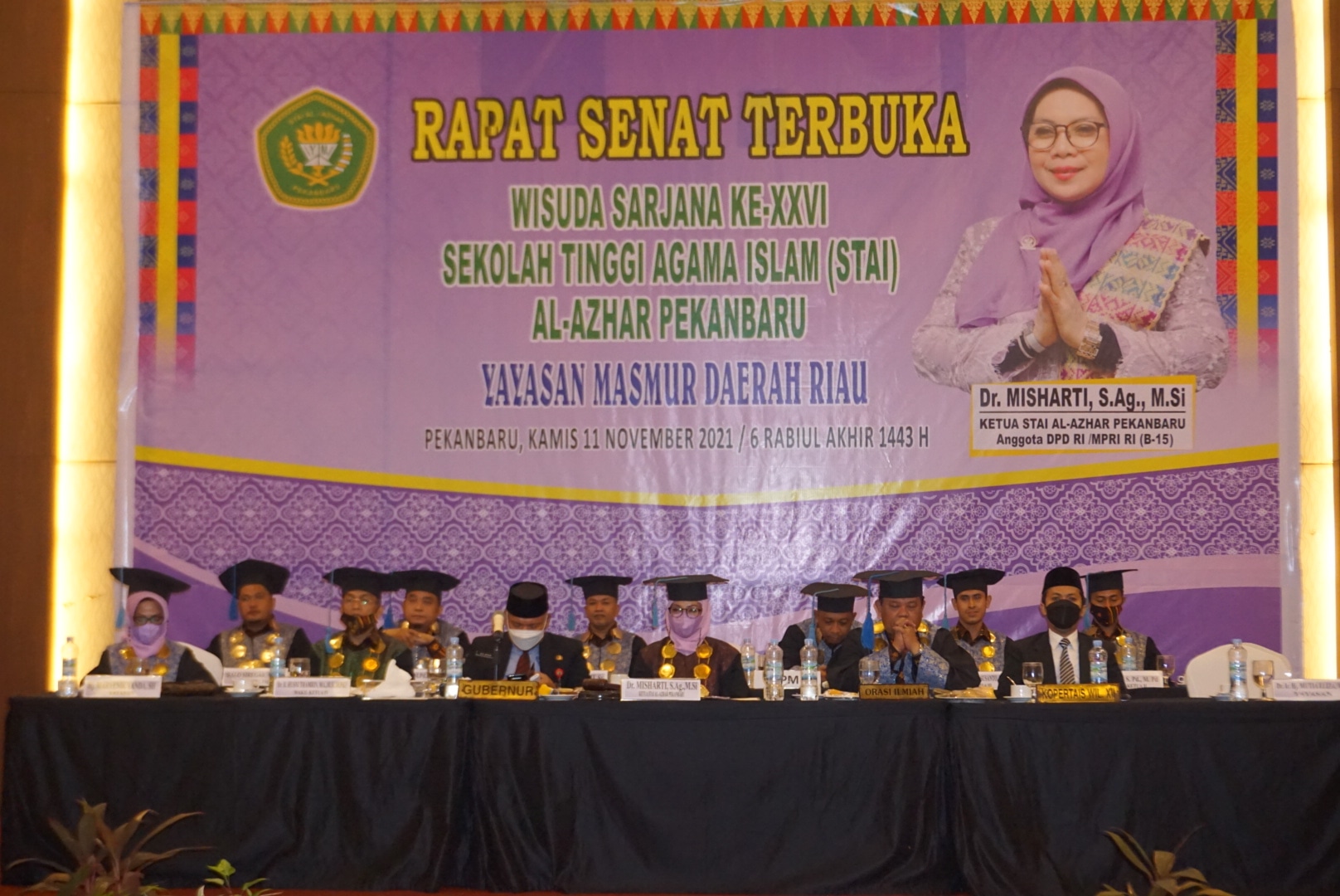 Wisuda ke XXVI (26) itu, dilaksanakan di Ballroom Hotel Aryaduta, Jalan Diponegoro, Kota Pekanbaru, Kamis (11/11/2021). Hadir pada wisuda, Gubernur Provinsi Riau yang diwakilkan oleh Kepala Dinas Pendidikan Provinsi Riau, Zul Ikram SPd MPd, Danrem 031/Wira Bima yang diwakilkan Kasi Pers Korem 031/Wira Bima, Kolonel CAj Paham Priyono SE MM, Direktur Pascabayar Sarjana UIN Suska Riau, Prof Dr Ilyas Husti, Kepala OJK Provinsi Riau, Koordinator Perguruan Tinggi Islam Wilayah XII Riau-Kepri yang diwakilkan Sekretaris, Ahmad Mashari SHi MA, Ketua Yayasan Masmur Daerah Riau diwakilkan Pembina Yayasan Masmur, Dr Muhammad Husni Thamrin MSi MPd, Ketua STAI Al-Azhar Pekanbaru, Dr Misharti SAg MSi