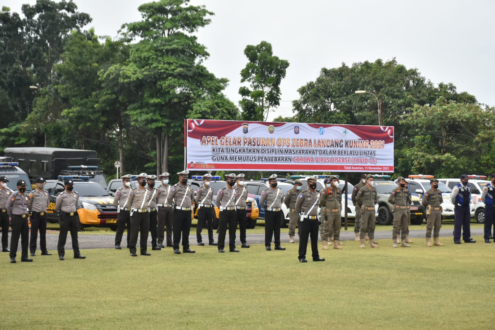 Dimana, apel Gelar Pasukan berlangsung dihalaman Mapolres Kuansing, yang dikuti unsur Personi POLRI, TNI, Dishub, SatPol PP dan Jasa Raharja Kuantan Singingi, ditandai dengan Penyematan Pita Operasi kepada perwakilan unsur tersebut pertanda dimulainya Operasi Zebra 2021, di wilayah hukum Kabupaten Kuantan Singingi.