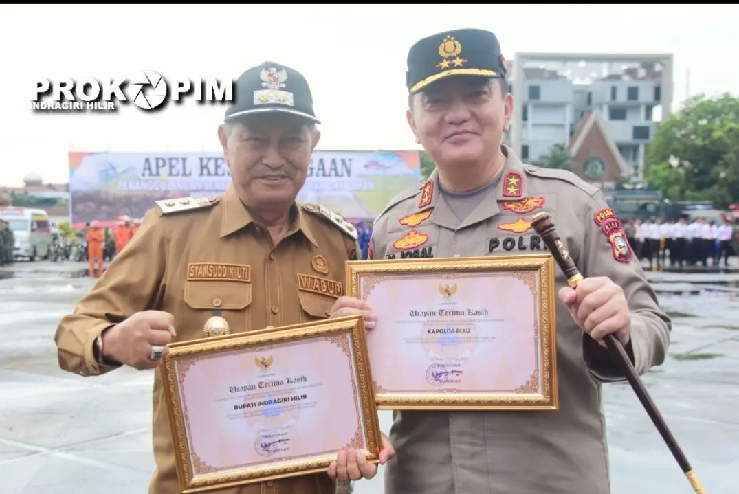 Usai apel Wagubri Brigjen TNI (Purn) Edy Natar Nasution menyerahkan penghargaan kepada Pemda Kabupaten Indragiri Hilir atas dukungan dan partisipasinya dalam rangka pencegahan dan penanggulangan kebakaran Hutan dan Lahan di Provinsi Riau yang di Terima Wakil Bupati H.Syamsuddin Uti.