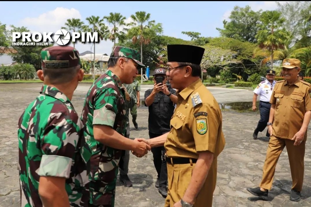 Kilasriau.com - Bupati bersama Wakil Bupati Kabupaten Indragiri Hilir menyambut kedatangan Komandan Resor Militer (Danrem) 031/Wira Bima Brigjen TNI Parlindungan Hutagalung, S.A.P dan rombongan dihalaman Kantor Bupati Jl. Akasia No. 1, Selasa (11/5/2023).