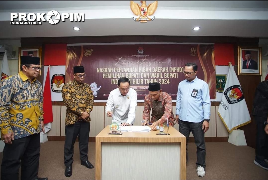 KILASRIAU.com - Bupati Inhil H.M.Wardan Melaksanakan Penandatanganan Naskah Perjanjian Hibah Daerah (NPHD) antara Pemerintah Kab. Inhil dengan KPU dan Bawaslu Kab. Inhil yang disaksikan oleh Ketua KPU Provinsi Riau Ilham Muhammad Yasir.