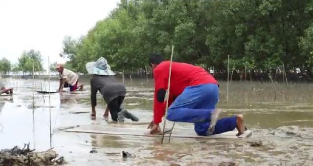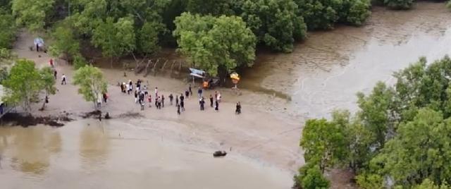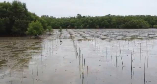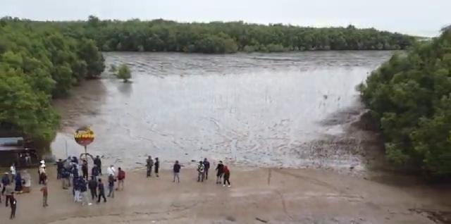 Selain hamparan lumpur yang sudah ditanami bibit Mangrove, juga terhampar hutan bakau. Nah, hutan bakau dan hamparan lumpur tadi lah yang "diciumi" oleh gelombang laut.