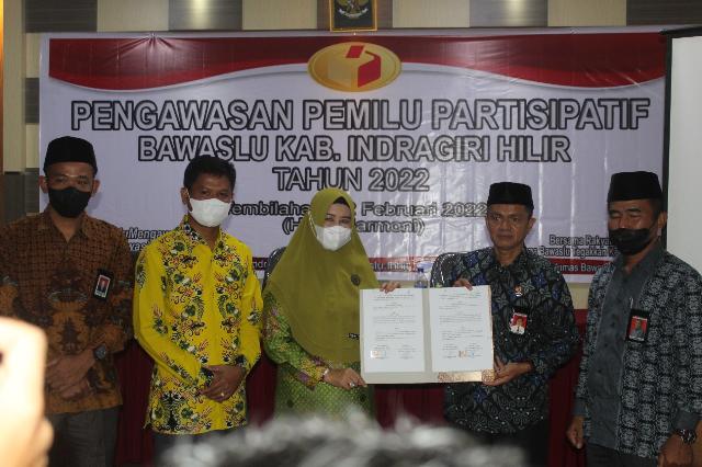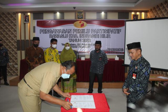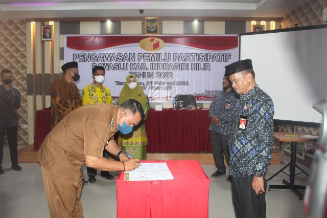 KILASRIAU.com - Sukses menyelenggarakan Sosialisasi Pengawasan Pemilu Partisipatif, Bawaslu Kabupaten Indragiri Hilir (Inhil) kembali melaksanakan penandatanganan Memorandum of Understanding (MoU) dan Moment of Alwaysness (MoA) yang berisi kerjasama baik dibidang kegiatan pendidikan politik maupun kegiatan pengawasan partisipatif, di Aula Hotel Harmoni Indragiri Tembilahan, Selasa (22/02/22).