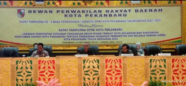 KILASRIAU.com  - DPRD Pekanbaru kembali menggelar rapat paripurna R-APBD Perubahan 2022. Tahapan Paripurna yang digelar Kamis (29/9/2022) malam itu  yakni Paripurna Jawaban Pemerintah Tentang Pandangan Umum Fraksi Tentang R-APBD Perubahan 2022.