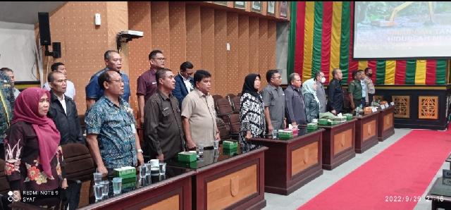Anggota DPRD Pekanbaru menyanyikan lagu Indonesia Raya dalam Rapat Paripurna Jawaban Pemerintah Tentang Pandangan Fraksi APBD P 2022, Kamis (29/9/2022) malam.