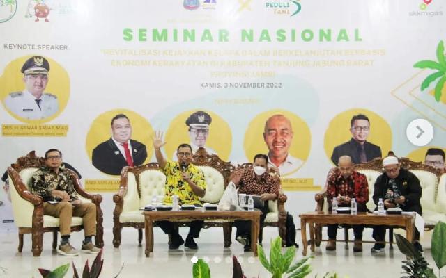 Kilasraiau.com, KUALA TUNGKAL - Asisten 1 Pemerintahan dan Kesejahteraan Rakyat Tantawi Jauhari, mewakili Bupati Indragiri Hilir menghadiri dan menjadi narasumber seminar Nasional dengan tema “Revitalisasi Kejayaan Kelapa Dalam Berkelanjutan dan Berbasis Ekonomi Kerakyatan”, di Balai Pertemuan Kantor Bupati Tanjung Jabung Barat, Provinsi Jambi, Kamis, (03/11/22).