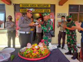KilasRiau.com - Koramil 04 Tualang memberikan tumpeng kepada personil Polsek Tuala.