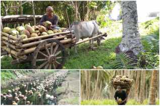 Keunikan Petani Kelapa dalam Pengangkutan Hasil Panen Buah Kelapa dari Kebun