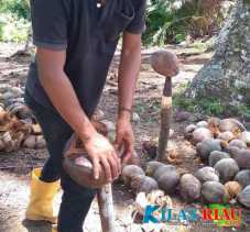 Kilasriau.com, INDRAGIRI HILIR - Satu lagi tradisi masyarakat petani kelapa di Kecamatan Reteh ketika mengupas.